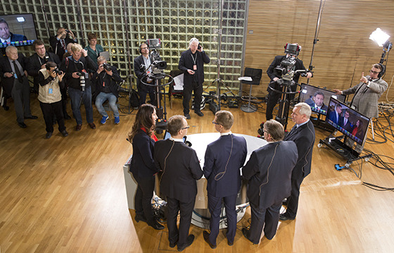 Eduskuntavaalien 2015 tulosilta eduskunnan Pikkuparlamentissa. Selin suurimpien puolueiden puheenjohtajat, oikealta Antti Rinne, Timo Soini, Alexander Stubb, Juha Sipilä sekä toimittaja. ​​​​​​​