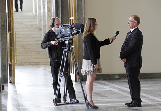 Toimittaja Sanna Ukkola haastattelee varapuhemies Pekka Ravia Eduskuntatalon valtiosalissa 2011.