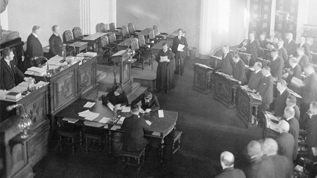 ​Ministeri Miina Sillanpää tuo hallituksen esityksen eduskunnalle vuonna 1927. Kuva: Eduskunta