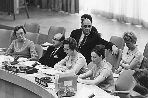 Kuvassa Naisten aseman toimikunta avaa kokouksen New Yorkissa vuonna 1967. Helvi Sipilä (kokouksen puheenjohtaja) istuu kuvassa keskellä. Kuva: Suomen YK-liitto