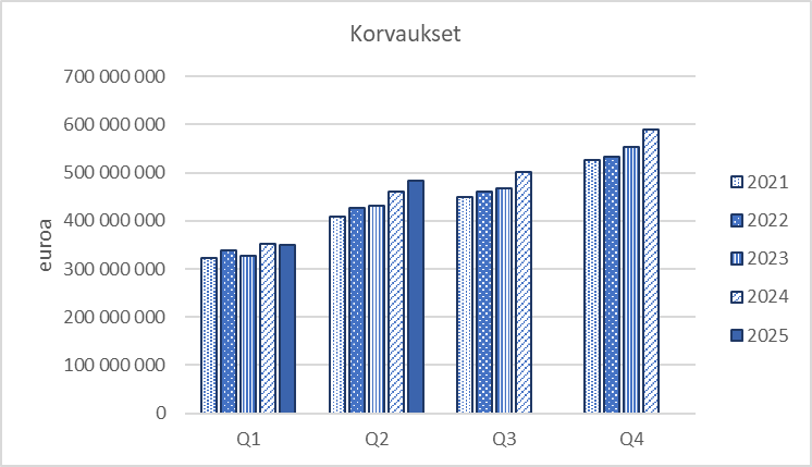 Lääkkeistä maksettiin vuonna 2023 yhteensä 1 792 miljoonaa euroa korvauksia. Peruskorvattujen lääkkeiden osuus oli 350 miljoonaa euroa ja erityiskorvattujen lääkkeiden 1 168 miljoonaa euroa. Vuotuisen omavastuuosuuden ylittymisen takia lisäkorvauksia maksettiin 274 miljoonaa euroa. Vuonna 2024 lääkekorvauksia maksettiin 1 898 miljoonaa euroa, mistä peruskorvattujen lääkkeiden osuus oli 380 miljoonaa euroa, ylemmän erityiskorvausluokan lääkkeiden osuus 742 miljoonaa euroa ja alemman erityiskorvausluokan osuus 482 miljoonaa euroa. Lisäkorvauksia maksettiin 294 miljoonaa euroa (Suomen Lääketilasto 2023 ja Suomen Lääketilasto 2024).