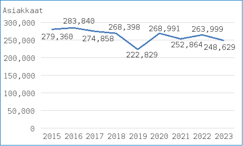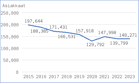 Suun terveystarkastus kirjattiin 1–6-vuotiaiden ikäryhmässä vuonna 2023 noin 140 300 lapselle. Tarkastettujen lasten määrä oli lähes 30 prosenttia pienempi kuin vuonna 2015, mikä johtunee suurimmaksi osaksi syntyvyyden laskusta. Alhaisimmillaan määrä on ollut tarkastelujaksolla 2015–2023 covid-19-pandemian aikana vuonna 2020, jolloin se oli alle 130 000. (Kuvio A). Osalla hyvinvointialueista suun terveystarkastus tehtiin jo ennen 1 vuoden ikää. Vuonna 2023 näitä tarkastuksia kirjattiin noin 7 800 asiakkaalle. Terveyden ja hyvinvoinnin laitos: Tilastoraportti 59/2024. [verkkojulkaisu]. Lasta odottavien, pikkulasten ja koululaisten terveystarkastukset 2023. 17.12.2024. Nieminen Sanna, Hietanen-Peltola Marke, Harjunmaa Ulla, Mahkonen Raimo ja Pyrhönen Kaisa: Viitattu [2.5.2025]. Saatavilla osoitteesta: https://www.julkari.fi/bitstream/handle/10024/150081/Tilastoraportti%2059%202024.pdf?sequence=1&isAllowed=y