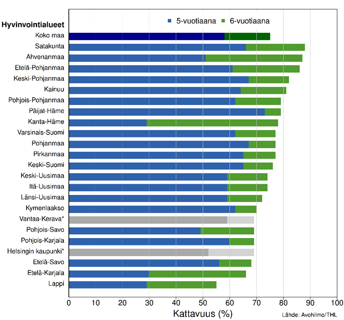 Puolentoistavuoden ikäisen lapsen laajan terveystarkastuksen kattavuus koko maassa oli 48 prosenttia ja neljävuotiaan 60 prosenttia. Kaikkien lastenneuvolan laajojen terveystarkastusten osalta Päijät-Hämeen ja Kymenlaakson hyvinvointialueet sijoittuivat maan viiden parhaimman kattavuuden joukkoon. Keski-Uusimaan ja Lapin hyvinvointialueet sekä Helsinki sijoittuivat kaikkien laajojen tarkastusten osalta viiden heikoimman kattavuuden joukkoon. Terveyden ja hyvinvoinnin laitos: Tilastoraportti 59/2024. [verkkojulkaisu]. Lasta odottavien, pikkulasten ja koululaisten terveystarkastukset 2023. 17.12.2024. Nieminen Sanna, Hietanen-Peltola Marke, Harjunmaa Ulla, Mahkonen Raimo ja Pyrhönen Kaisa: Viitattu [2.5.2025]. Saatavilla osoitteesta: https://www.julkari.fi/bitstream/handle/10024/150081/Tilastoraportti%2059%202024.pdf?sequence=1&isAllowed=y