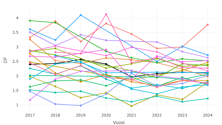 Kuvio D. Karioituneiden tai paikattujen hampaiden lukumäärä (DF) tarkastuksessa käyneillä 15-vuotiailla vuosina 2017–2024 hyvinvointialueittain (musta käyrä kuvaa koko maan tilannetta, muut käyrät eri hyvinvointialueita)