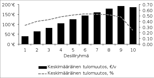 Alla olevaan kuvioon on koottu edellä mainittujen tuloveroperusteisiin tässä esityksessä tehtyjen muutosehdotusten yhteisvaikutukset tulodesiileittäin. Kuviosta käy ilmi, että verotus kevenee kaikissa tulodesiileissä hieman. Vaikutus on euromääräisesti suurin tulodesiilissä 9, eli suurituloisilla kotitalouksilla. Vaikutus on suhteellisesti suurin tulodesiileissä 6 ja 7. Kuviossa esitetyt muutokset on laskettu OECD:n modifioidun ekvivalenssi-asteikon mukaisilla kotitalouskohtaisilla ekvivalenteilla tuloilla.