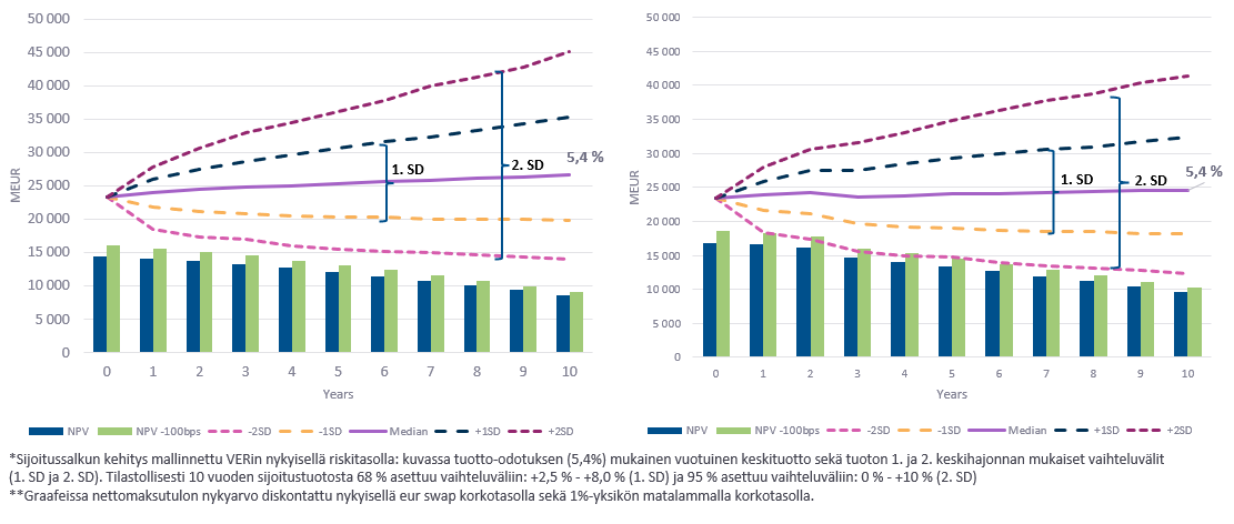 Alla olevassa kuviossa 4 näkyy 10 vuoden skenaario sijoitussalkun markkina-arvon kehitykselle ja nettosiirtojen nykyarvolle eri siirtovaihtoehdoilla rahaston nykyisellä riskitasolla. Vasemmanpuoleisessa kuviossa tarkastellaan tilannetta, jossa rahastosta ei tehtäisi lisäsiirtoja, kun taas oikeanpuoleisessa kuviossa tarkastellaan skenaariota, jossa ehdotetut lisäsiirrot talousarvioon toteutettaisiin. Skenaariossa mediaanituotto perustuu rahaston tuoton tulevaisuuden arvioituun tuotto-odotukseen, joka on noin 5,4 prosenttia vuodessa ja näkyy kuviossa violetilla viivalla. Kuviossa on esitetty lisäksi tuottojen vaihteluväli keskihajonnan (±1 SD, ±2 SD) päässä mediaanista. Kaksi ylintä käyrää kuvaavat optimistisempia tuottoskenaarioita ja kaksi alinta käyrää kuvaavat pessimistisempiä tuottoskenaarioita. Heikoimmassa skenaariossa vuosittainen keskimääräinen tuotto-olettama kymmenen vuoden ajanjaksolla on 0 prosenttia ja parhaassa +10 prosenttia. Tilastollisesti sijoitustuotto asettuu näiden käyrien väliin noin 95 prosentin todennäköisyydellä.