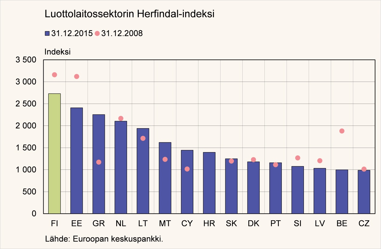 Suomen luottolaitossektorin rakenteen erityispiirre on sen suuri keskittyneisyys. Suomen kaksi suurinta toimijaa ovat OP Ryhmä ja Danske Bank Oyj Nordea Pankki Suomi Oyj:n muututtua vuoden 2017 alusta lukien sivuliikkeeksi. Nordea toimii Suomessa lisäksi kiinnitysluottopankkitoimintaa harjoittavan yhtiön kautta. Mainitut kolme toimijaa muodostavat noin 90 prosenttia markkinasta. Vaikka OP Ryhmän ja Dansken taseita sekä laskennallisesti arvioitua Nordean tasetta oikaistaisiin poistamalla niihin sisältyvät pohjoismaisten konsernien sisäiset erät ja vakuutusliiketoiminnan vaikutus, on Suomen luottolaitossektori yksi euroalueen keskittyneimmistä.