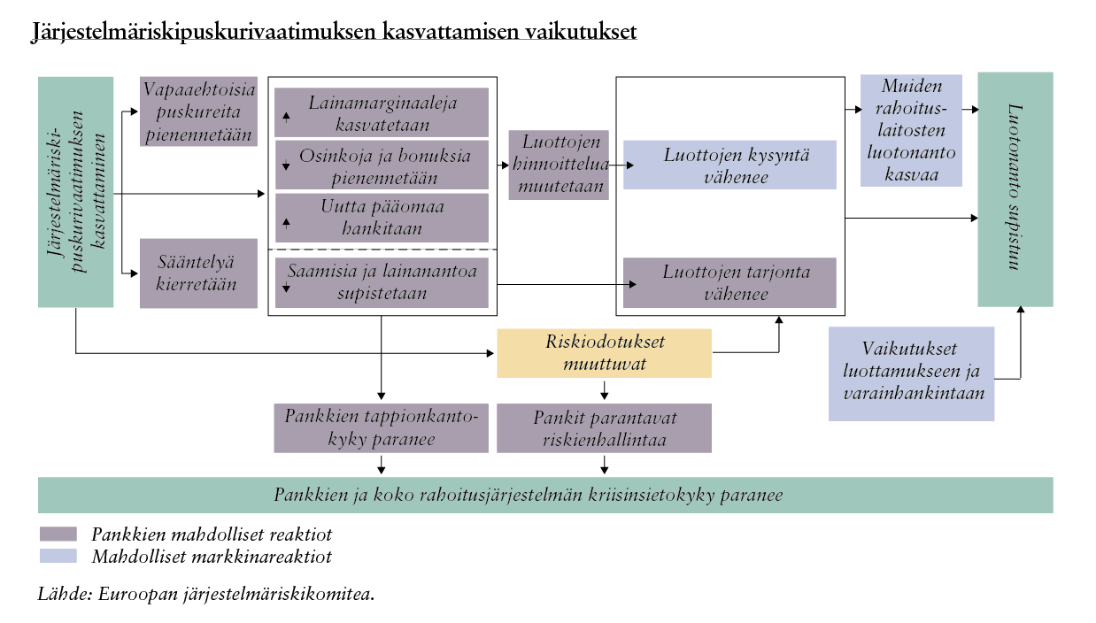 Hallituksen esityksessä HE 39/2014 vp päätöstä olla ottamatta järjestelmäriskipuskuria lakiin perusteltiin lisäksi maamme finanssimarkkinoiden vakaudella ja suhteellisella koolla, joiden ei katsottu edellyttävän EU-lainsäädännön vähimmäisvaatimuksia tiukempien pääomavaatimusten käyttöönottoa. Huomioon otettiin tällaisesta lisävaatimuksista mahdollisesti koituvat lyhyen aikavälin vaikutukset luottotarjonnalle ja kasvulle.