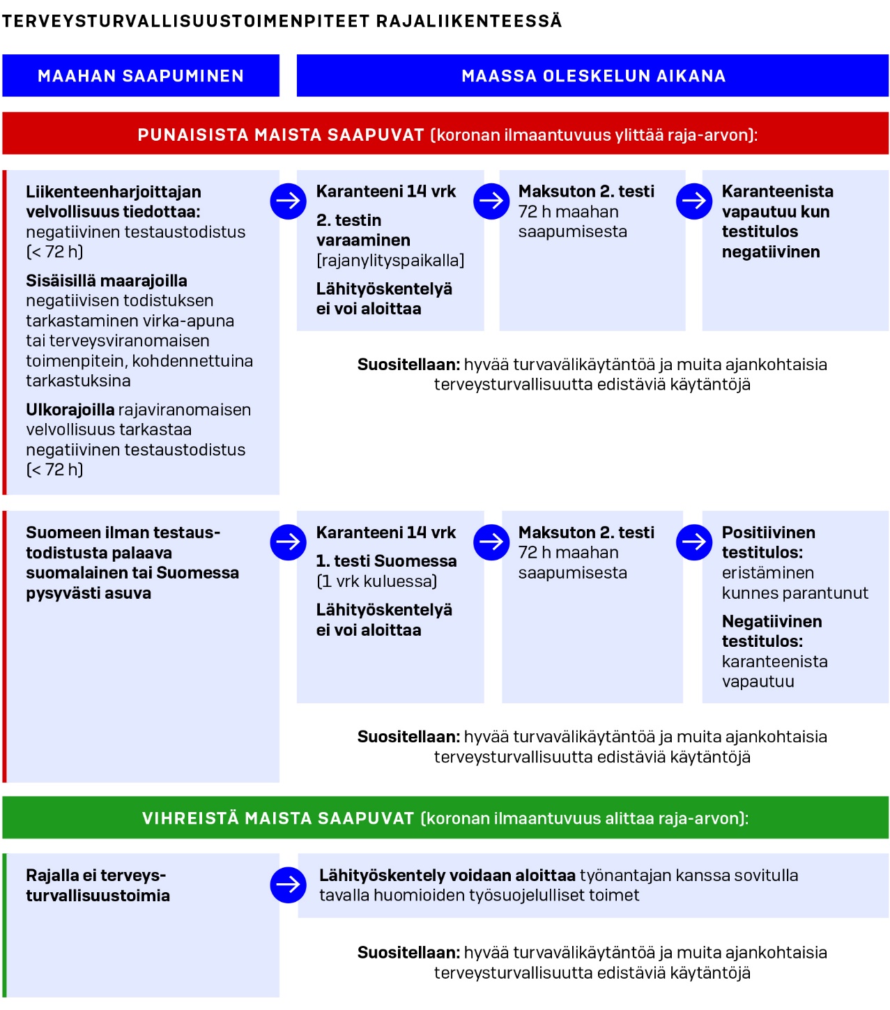 Suomen kansalaisia ja Suomessa pysyvästi asuvia ulkomaalaisia suositellaan pysymään omaehtoisessa karanteenissa kulloinkin voimassa olevan Terveyden ja hyvinvoinnin laitoksen(THL) julkaiseman suosituksen ajan, ja annetaan suojautumisohjeet majapaikkaan kulkemisen ajaksi. Sama koskee EU:n jäsenvaltioiden ja Euroopan talousalueeseen kuuluvien valtioiden (EU/ETA-valtiot) rajoilta tai ulkorajoilta tulevia matkustajia, joilla on todistus negatiivisesta testituloksesta.