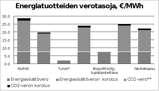 *Turpeella on energiasisältöveron sijaan energiavero, joka ei perustu turpeen energiasisältöön eikä polton hiilidioksidipäästöön muiden energiatuotteiden tavoin