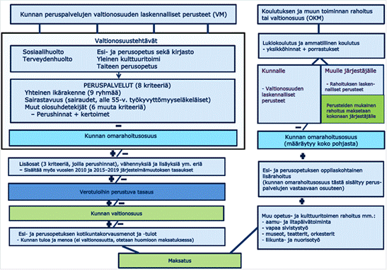 Valtionosuusjärjestelmän perusrakenne säilyy ennallaan myös sosiaali- ja terveydenhuolto- ja maakuntauudistuksen voimaantulon jälkeen. Merkittävin kuntakohtaisia valtionosuuksia koskevamuutos tapahtuu verotuloihin perustuvassa valtionosuuden tasauksessa. Kunnallisveron määrä pienenee noin 60 prosenttia ja yhteisöverosta kunnille tuleva määrä lähes 40 prosenttia. Tämä merkitsee tasauksen tasausrajan oleellista alentumista nykyisestä. Kuntien tasauslisät vähenevät 1,3 miljardista eurosta alle 0,7 miljardiin euroon eli ne lähes puoliintuvat. Järjestelmämuutoksen tasaus toteutetaan vaiheittain, siten että uudistus ei aiheuta yhdellekään kunnalle yli yhden tuloveroprosenttiyksikön muutospainetta. Esityksessä ehdotetaan rajoitettavaksi kunnan oikeutta päättää veron korottamisesta vuonna 2019.