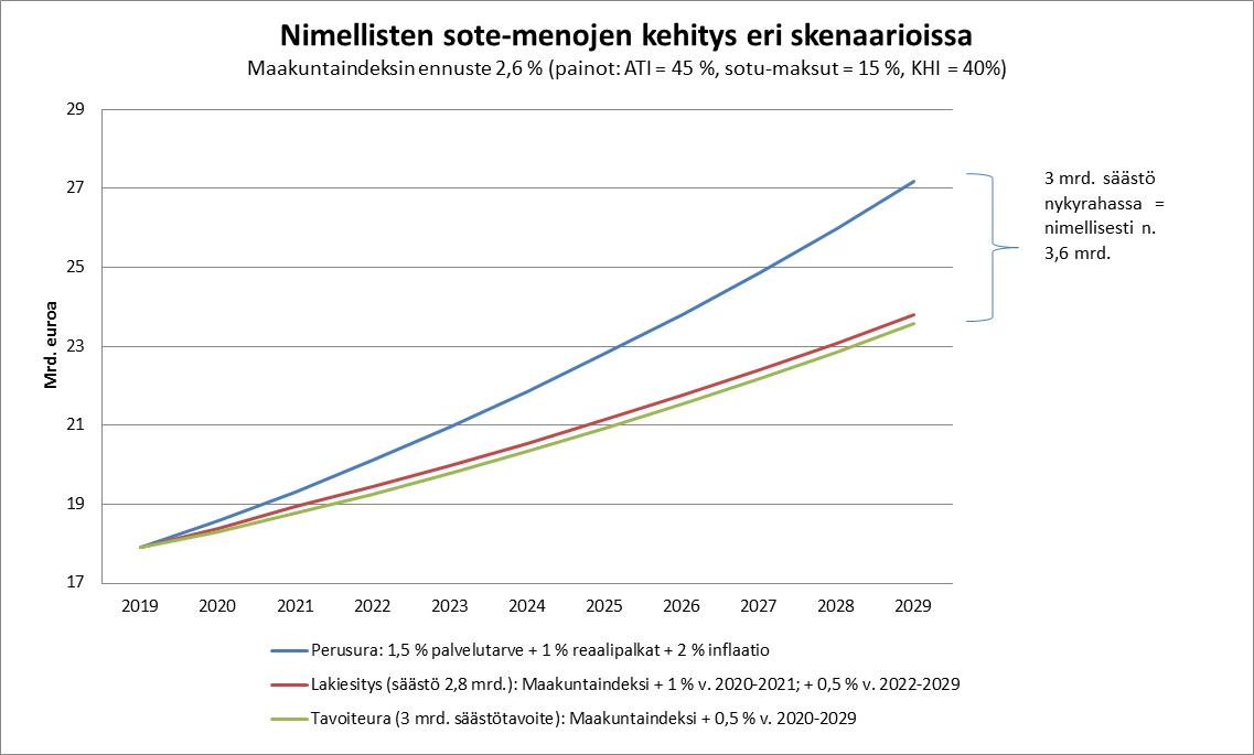 Maakunta- ja sosiaali- ja terveydenhuoltouudistuksen tavoitteena on myös vähentää julkisen talouden kestävyysvajetta. Esityksen mukaiset uudistukset mahdollistavat kustannusten kasvun hillinnän siten, että vuoteen 2030 mennessä sosiaali- ja terveydenhuollon kustannukset ovat vuositasolla 3 miljardia euroa alemmat kuin ne olisivat ilman uudistusta. Lainsäädäntöön perustuvien muutosten ja uudistusten lisäksi tämä edellyttää aktiivista ja taitavaa muutosjohtajuutta, johon uudistuksen toimeenpanossa on kiinnitettävä erityistä huomiota.