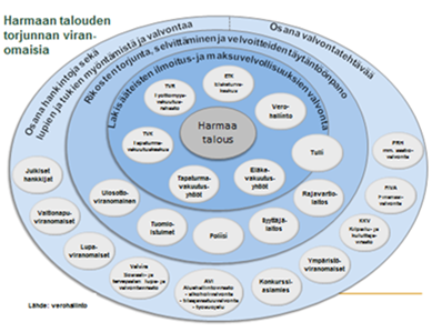 Harmaata taloutta torjutaan lupaviranomaisten lupavalvonnan lisäksi useiden eri viranomaisten toimilla ja yhteistyöllä eri viranomaisten ja elinkeinoelämän kanssa. Harmaata taloutta torjutaan esimerkiksi poliisin ja Tullin talousrikostorjunnassa ja rikoshyödyn jäljittämisessä, Verohallinnon ja Tullin verovalvonnassa, rikosprosessissa ja ulosottotoimessa, konkurssiasiamiehen toiminnassa, aluehallintoviraston työsuojeluvalvonnassa ja tilaajavastuun valvonnassa, lupaviranomaisten lupavalvonnassa, työeläke- ja muiden sosiaalivakuutusmaksujen ja julkisten tukien valvonnassa.