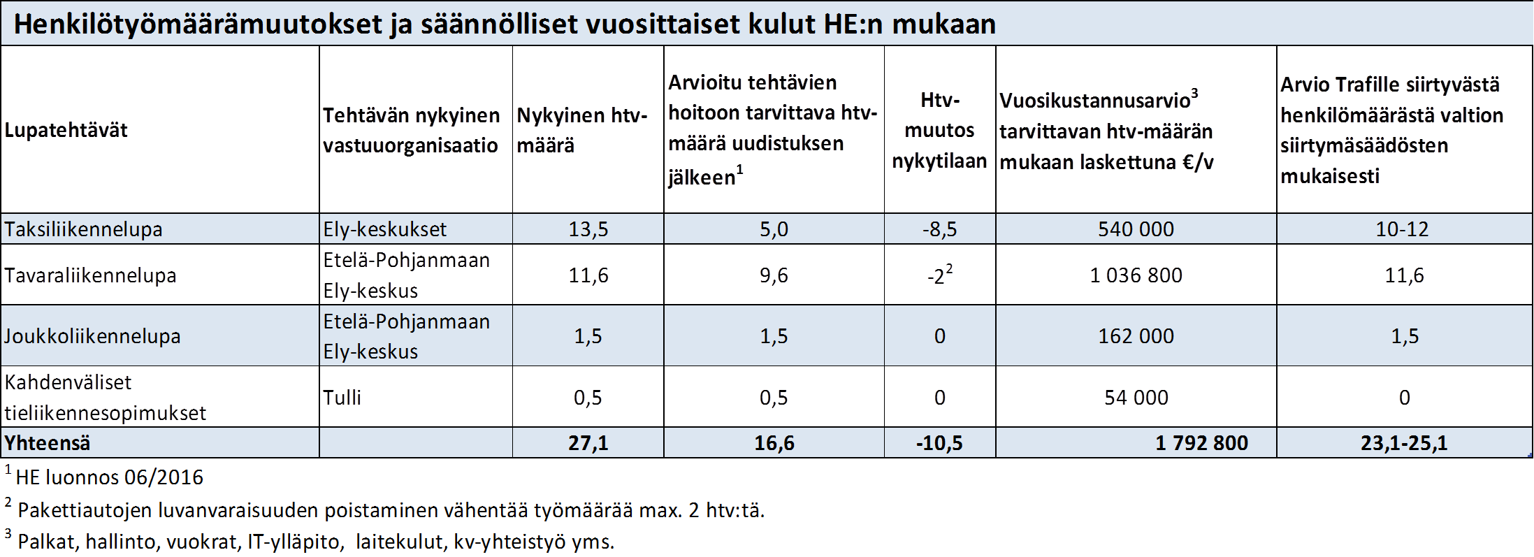 Vaikutukset Liikenteen turvallisuusvirastossa. Liikenteen turvallisuusviraston arvioon siitä, mitä tieliikenteen alalletulolupien (taksilupa, tavaraliikennelupa, joukkoliikennelupa) siirtäminen sille merkitsisi, sisältyvät myös EU-lainsäädännöstä seuraavat eräät tietojenvaihtoon liittyvät uudet tehtävät. Kokonaisuus huomioon ottaen arvioidaan, että tavara- ja henkilöliikennelupatehtäviin tarvitaan saman verran henkilötyövuosia kuin tähänkin mennessä. Taksilupien osalta vähenisi tarvittava henkilötyövuosimäärä noin kolmannekseen eli viiteen henkilötyövuoteen. Kahdenvälisten tieliikennesopimusten uudet tehtävät lisäisivät Liikenteen turvallisuusviraston työmäärää noin 0,5 henkilötyövuotta.