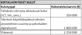 Taulukko: Tehtävien siirtoon liittyvät kertaluonteiset kustannukset.