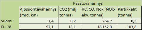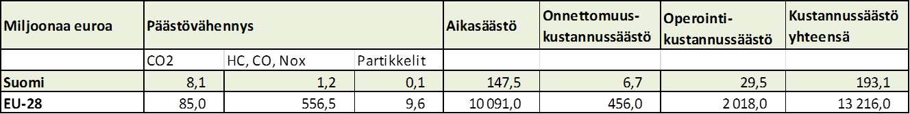Taulukko. Ajosuoritteen ja päästöjen vähennys yhteentoimivan tiedon ja lippujärjestelmien aikaansaaman kulkumuotojakauman muutosten kautta. Lähde: “To develop and validate a European passenger transport information and booking system across transport modes” (http://ec.europa.eu/transport/themes/its/studies/doc/20140812-july9thversion-awtfinalreport.pdf).