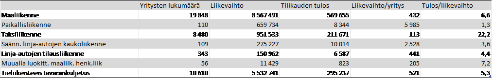 Yllä on esitetty taulukko maanliikenteen toimijoiden keskeisistä tunnusluvuista vuosilta 2006-2014. Yritysten lukumäärä, liikevaihto ja tilikauden tulos ovat keskimääräisiä lukuja eri vuosien arvoista. Seuraavat kaksi saraketta kuvaavat keskimääräisiä yrityskohtaisia lukuja samoilta vuosilta. Liikevaihto ja tilikauden on esitetty tuhansina euroina ja yrityskohtainen liikevaihto tuhansina euroina per yritys. Tilikauden tuloksen osuus liikevaihdosta on esitetty prosentteina.