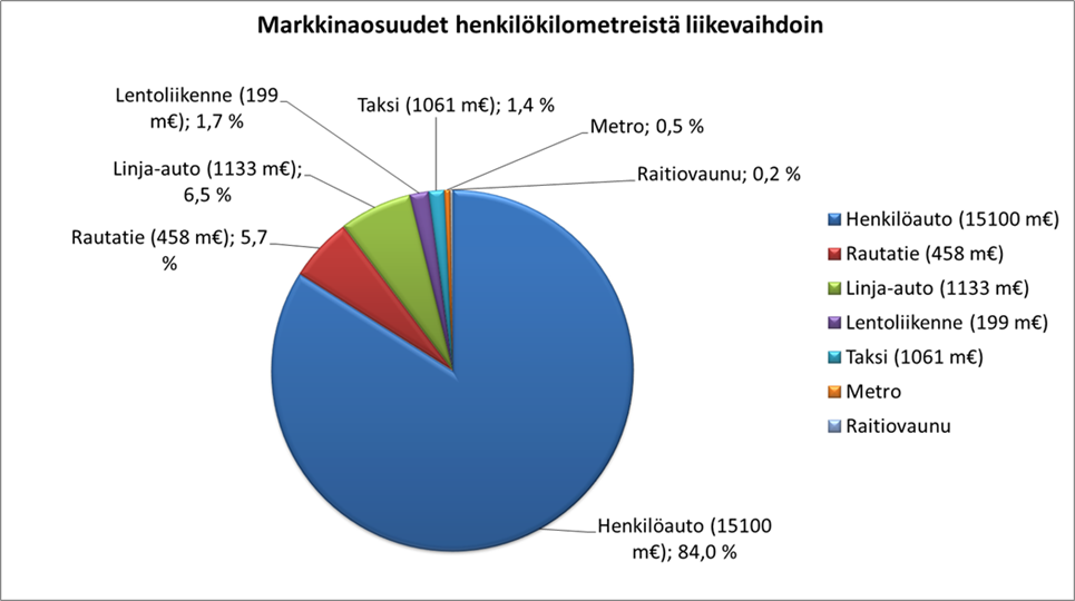 Henkilöliikenteen markkinaosuudet ovat jakautuneet Suomessa viime vuosina siten, että henkilökilometreistä 84 prosenttia tehdään henkilöautolla, 6,5 prosenttia linja-autolla, 5,7 prosenttia rautateillä, 1,7 prosenttia lentoliikenteessä ja 1,4 prosenttia takseilla. Metron ja raitiovaunun osuus jää alle prosenttiin. Julkisen liikenteen osuus tehdyistä matkoista on pysynyt viime vuosina lähes samana.
