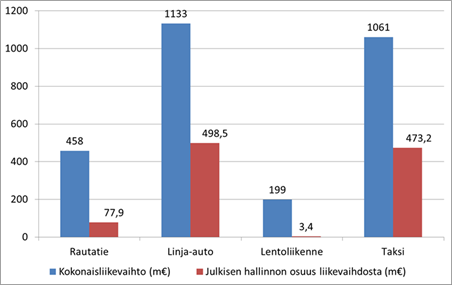 Julkisen hallinnon osuus koko 2,85 miljardin liikevaihdosta oli 1,05 miljardia euroa. Suurimmat julkisen hallinnon osuudet ovat linja-autoliikenteessä ja taksiliikenteessä, joissa kummassakin osuudet ylittävät 40 prosenttia. Julkishallinto rahoittaa liikennettä suoraan ja matkakustannuksia korvaamalla. Tämä summa on kasvanut tasaisesti. Esimerkiksi vuonna 2001 julkinen rahoitus jäi alle puoleen miljardiin, joten reilussa kymmenessä vuodessa rahoituksen määrä on kaksinkertaistunut. Tämän lisäksi valtio ja kunnat käyttivät liikenneinfrastruktuuriin vuonna 2013 yhteensä 3,8 miljardia euroa.