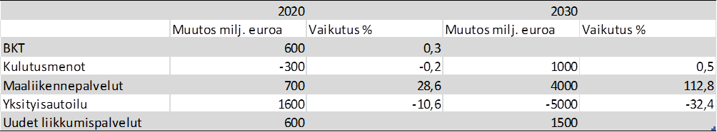 Alla on esitetty arvioitu maaliikennepalvelujen henkilöstömäärän kehitys vuoteen 2020 mennessä. Taulukossa on esitetty ennuste kehityksestä nykytrendin mukaisesti sekä liikennekaaren voimaantulon myötä. Arvioissa on hyödynnetty tilastokeskuksen tietoja yritysten liikevaihdoista ja henkilöstömääristä vuosilta 2010-2014. Laskelmissa on laskettu alakohtaiset keskiarvot liikevaihdon ja henkilöstömäärän suhteesta ja tätä keskimääräistä suhdetta on hyödynnetty ennusteissa. Taulukossa on arvioitu liikevaihdon kehitys nykytrendin mukaisella kehityskäyrällä ja sekä sillä kehityskäyrällä, joka lakiesityksen voimaantulosta arvioidaan seuraavan. Arvion mukaan liikennealalle syntyisi lähes 15 000 uutta työpaikkaa vuoteen 2020 mennessä.