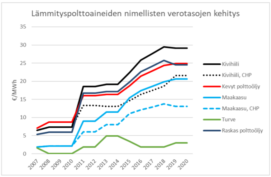 Energiaverotuksen rakenne muutettiin nykyisen kaltaiseksi vuoden 2011 alusta lailla 1399/2010 ja samalla lämmityspolttoaineiden kokonaisverotasoja korotettiin rakennemuutoksen yhteydessä keskimäärin noin 2,5-kertaisesti työnantajan kansaneläkemaksun poistamisesta aiheutuvien verotuottomenetysten osittaiseksi korvaamiseksi. Lämmityspolttoaineiden verotasoihin on tehty vuoden 2011 jälkeen useita korotuksia. Veronkorotukset ovat kohdistuneet pääasiassa hiilidioksidiveroon. Kuvasta 1 näkyy lämmityspolttoaineiden nimellisverotasojen kehitys.