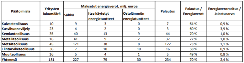 Energiaintensiivisten yritysten käyttämän sähkön ja lämmityspolttoaineiden energiaverotusta alennetaan vuosittain hakemuksesta maksettavalla veronpalautuksella. Palautus koskee teollisuutta, kaivostoimintaa ja kasvihuoneviljelyä. Palautusta maksetaan siltä osin kuin yrityksen hankkimiin tai käyttämiin muihin valmisteveron alaisiin energiatuotteisiin kuin liikenne- ja työkonepolttoaineisiin sisältyvien valmisteverojen määrä on enemmän kuin 0,5 prosenttia yrityksen jalostusarvosta. Tältä osin yrityksellä on oikeus saada palautuksena maksetuista energiaveroista 85 prosenttia. Palautuksesta vähennetään kuitenkin omavastuuosuutena 50 000 euroa. Vuonna 2019 energiaintensiivisten yritysten palautusta maksettiin 177 yritykselle yhteensä 228 miljoonaa euroa. Palautusta saaneet yritykset maksoivat energiaveroja yhteensä 330 miljoonaa euroa, joten niiden nettomääräinen verorasitus oli 102 miljoonaa euroa. Energiaveroista palautettiin siten noin 70 prosenttia. Taulukossa 1 on esitetty valtiovarainministeriön arvio tällä hetkellä veronpalautuksen piirissä olevien yritysten energiaverojen ja veronpalautusten jakautumisesta päätoimialoittain. Arvio perustuu tietoihin yritysten energiatuotteiden käytöstä ja jalostusarvosta vuonna 2018 päättyneellä tilikaudella sekä vuoden 2020 verotasoihin.