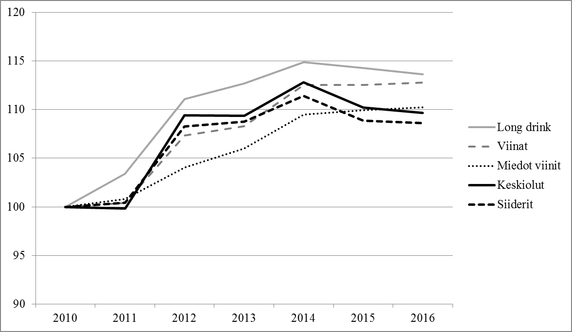 Veronkorotuksen vaikutus alkoholin tilastoidun kulutuksen vähentymiseen on arvioitu kysynnän hintajoustojen avulla, jotka ovat väkevien juomien ja välituotteiden osalta 0,72, viinin osalta -1,06 ja oluen osalta -0,40 (Ollikainen 2016: Alkoholijuomien kysynnän joustot Suomessa vuosina 2001—2015).