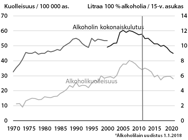 Suomessa alkoholin kokonaiskulutus kolminkertaistui vuodesta 1960 vuoteen 2005, jolloin alkoholin kokonaiskulutus 15 vuotta täyttänyttä asukasta kohti oli 12,1 litraa sataprosenttista alkoholia. Vuosien 2007 ja 2017 välillä alkoholin kokonaiskulutus laski noin viidenneksellä (kuvio 1). Useat alkoholiveron korotukset ja vuoden 2008 jälkeen pitkään jatkunut talouden laskusuhdanne myötävaikuttivat tähän kehitykseen voimakkaasti. Vuonna 2023 alkoholin kokonaiskulutus 15 vuotta täyttänyttä kohti oli 8,7 litraa 100-prosenttista alkoholia. Alkoholijuomien kulutus 2023. Tilastoraportti 39/2024, THL 17.6.2024. https://thl.fi/tilastot-ja-data/tilastot-aiheittain/paihteet-ja-riippuvuudet/alkoholi/alkoholijuomien-kulutus