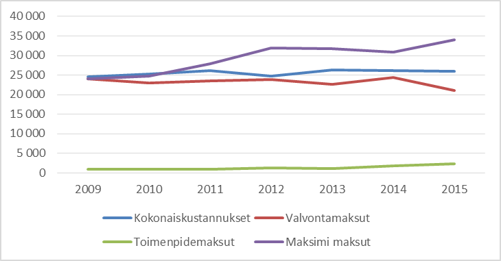 Finanssivalvonnan kustannusten ja valvonta- ja toimenpidemaksujen kehitystä vuosina 2009—2015 on kuvattu alla taulukossa 1 ja kuvioissa 1 ja 2. Vuoden 2008 valvontamaksulaki laadittiin siten, että lain enimmäismäärä kerättiin täysimääräisenä, jotta Finanssivalvonnan kustannukset kyettiin kattamaan sen ensimmäisenä kokonaisena toimintavuotena. Tämän jälkeen rahoitussektoriin kuuluvien valvottavien taseiden kasvu on johtanut siihen, että lain mahdollistama maksujen enimmäismäärä on kasvanut kymmenellä miljoonalla noin 34 miljoonaan euroon. Sen sijaan Finanssivalvonnan kokonaiskustannusten ja tosiasiassa kerättyjen valvontamaksujen kehitys on ollut hyvin maltillista. Myös Pohjoismainen vertailu osoittaa, että Finanssivalvonnan kustannuskehitys on ollut maltillista erityisesti suhteessa Ruotsiin ja Tanskaan.