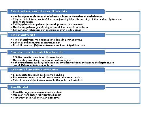 Julkisten työvoimapalvelujen järjestämisvastuu siirrettäisiin työ- ja elinkeinotoimistoilta kunnille. Kunnille siirtyisivät myös elinkeino-, liikenne- ja ympäristökeskusten julkisiin työvoimapalveluihin liittyvät hankintatehtävät ja elinkeino-, liikenne- ja ympäristökeskusten sekä työ- ja elinkeinotoimistojen kehittämis- ja hallintokeskuksen julkisiin työvoimapalveluihin liittyvät maksatustehtävät. Nykyiset työ- ja elinkeinotoimistot lakkautettaisiin. Siirtyviä tehtäviä valtiolla hoitava henkilöstö siirtyisi liikkeenluovutuksella kuntiin tai kuntayhtymiin.