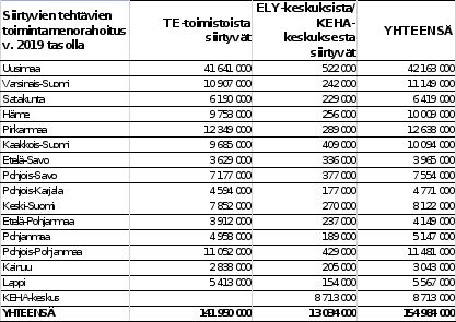 Lisäksi uudistuksessa järjesteltäisiin työ- ja elinkeinohallinnon alan valtiolle jääviä tehtäviä uudestaan. Työntekijän oleskelulupaan liittyvät tehtävät siirtyisivät Maahanmuuttovirastolle. Työttömyysturvan harkintaa vaativien työvoimapoliittisten lausuntojen antaminen, palkkaturvatehtävät sekä eräät neuvontatehtävät siirtyisivät elinkeino-, liikenne- ja ympäristökeskusten sekä työ- ja elinkeinotoimistojen kehittämis- ja hallintokeskukselle. Kehittämis- ja hallintokeskus vastaisi myös työvoimapalvelujen valtakunnallisista tietojärjestelmäpalveluista, jotka muodostuisivat valtakunnallisesta tietovarannosta, asiakastietojärjestelmäkokonaisuudesta ja palvelualustasta. Kehittämis- ja hallintokeskuksen tehtävä olisi myös osaajien maahanmuuton edistäminen, joka olisi osa niin sanottua Work in Finland -toimintoa.