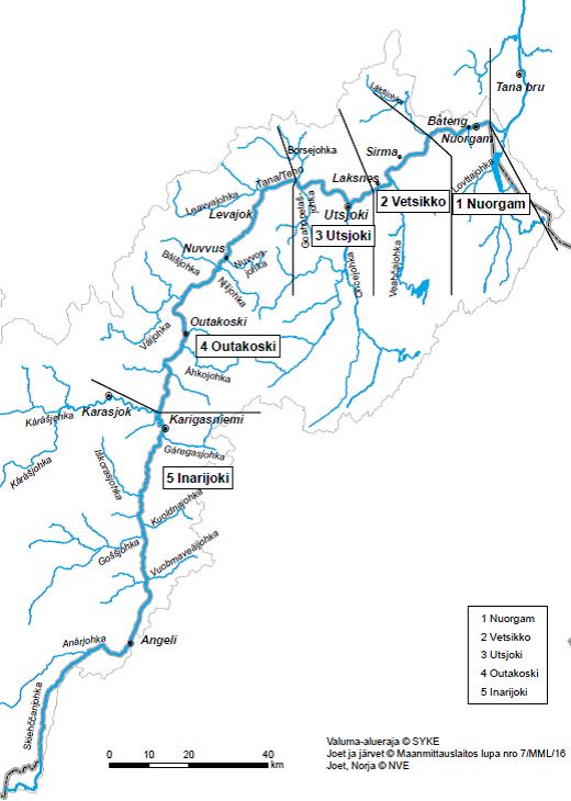 1 §.Soveltamisalue. Pykälässä määrätään, että kalastussääntö on voimassa sillä osalla Tenojokea, Inarinjokea ja Skietshamjokea, joka muodostaa Suomen ja Norjan välisen valtakunnan rajan. Norja antanee kansallisen kalastussäännön omalle rajajokiosuudelleen. Norjalle kuuluvalla Tenon alaosalla kalastussäännön kalastusta koskevat määräykset eivät voi olla lievempiä kuin rajajokiosuudella kulloinkin voimassa olevat määräykset. Tenon sivujokia koskevat kalastussäännöt määritellään kansallisesti ja ne voivat vaihdella sivuvesien lohikantojen tilanteen mukaisesti.