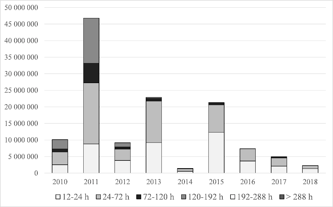 Jakeluverkon toimintavarmuutta koskevasta siirtymäajasta säädetään 119 §:n siirtymäsäännöksessä. Pykälän mukaan jakeluverkonhaltijan on täytettävä 51 §:n sähkönjakelun keskeytysten aikarajavaatimukset vastuualueellaan viimeistään 31 päivänä joulukuuta 2028. Vaatimusten on täytyttävä vuoden 2019 loppuun mennessä vähintään 50 prosentilla jakeluverkon kaikista käyttäjistä vapaa-ajan asunnot pois lukien ja vuoden 2023 loppuun mennessä vähintään 75 prosentilla jakeluverkon kaikista käyttäjistä vapaa-ajan asunnot pois lukien. Vapaa-ajan asunnot on rajattu välitavoitteiden ulkopuolelle, ja verkonhaltija voi tarkastella näillä alueilla toteutettavia toimenpiteitä tärkeysjärjestykseltään viimeisenä. Energiavirasto on voinut tietyissä tilanteissa myöntää jakeluverkonhaltijalle pidennyksiä täytäntöönpanoaikoihin. Esimerkiksi keskimääräistä enemmän maakaapeleita asentamaan joutuvat jakeluverkonhaltijat ovat voineet hakea täytäntöönpanoajan pidennystä aina vuoden 2036 loppuun saakka. Energiavirasto on myöntänyt täytäntöönpanoajan pidennyksen yhteensä 10 jakeluverkonhaltijalle.