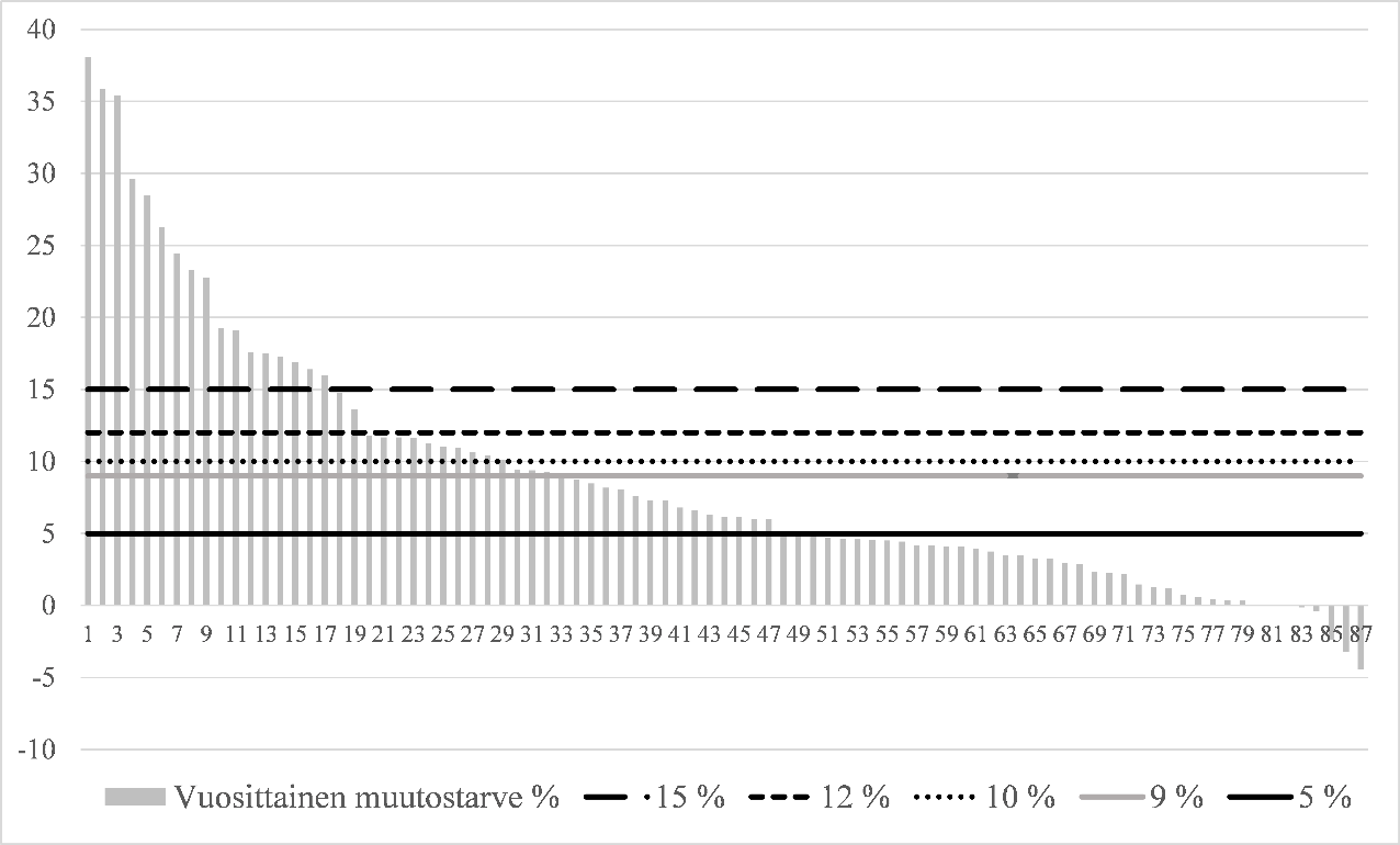 Nykyistä 15 prosenttia matalamman korotuskaton rajan määrittäminen siten, että se ei muodostuisi perustuslain omaisuuden suojan näkökulmasta ongelmalliseksi, on hankalaa, koska verkonhaltijoiden taloudelliset tilanteet ja rahoitustarpeet vaihtelevat voimakkaasti. Lisäksi usea verkonhaltija on omaehtoisesti noudattanut varovaista tariffilinjaa, jonka seurauksena Energiavirasto on vahvistanut niille aiemmilta valvontajaksoilta suuria alijäämiä suhteessa valvontajakson sallittuun maksimituottoon. Hallituksen esityksen valmistelussa korotuskaton ylärajan leikkaamisen vaikutuksia on pyritty arvioimaan vuodet 2016-2019 kattaneen valvontajakson kuluessa verkonhaltijoille syntyneiden sallitun maksimituoton alijäämien perusteella. Verkonhaltijoilla on tulevina vuosina aikaa sopeuttaa toimintaansa nykyistä matalampaan korotuskaton ylärajaan, toisin kuin päättyneen valvontajakson osalta. Verkon omistajien tuoton arvioidaan myös pienenevän Energiaviraston vahvistamien laskentamenetelmien sisältämän pääoman koron ja verkko-omaisuuden muodostaman tuottopohjan määrityksessä käytettävien yksikköhintojen laskun seurauksena siten, että pienenemisen vaikutukset ulottuvat ainakin 2020-luvun loppupuoliskolle saakka. Tulevien hinnankorotusten leikkaamiseen arvioidaan tämän vuoksi olevan liikkumavaraa, mutta sen täsmällinen arviointi on vaikeaa.