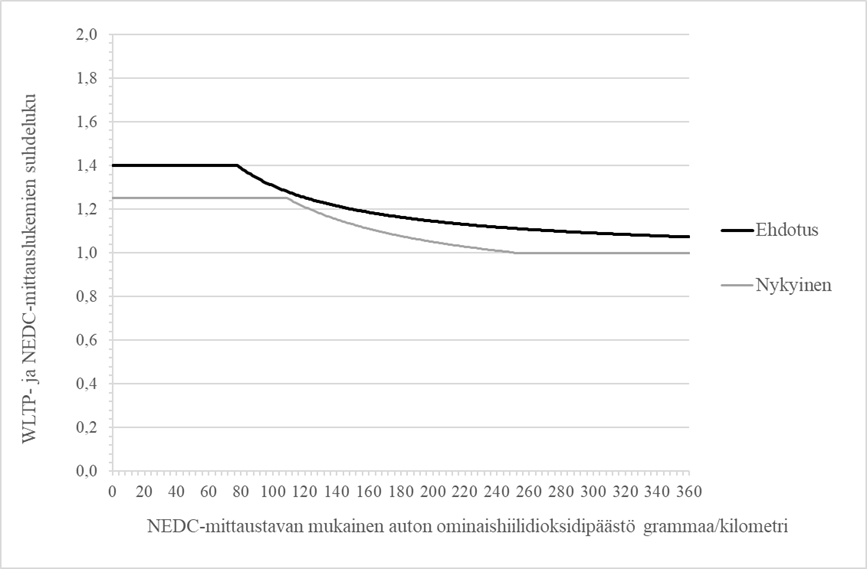 Kuva 1. WLTP- ja NEDC-mittaustapojen mukaisten hiilidioksidipäästöjen suhde eri päästötasoilla nykyisessä ja ehdotetussa sopeutuksessa.