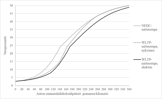 Jotta autoverotuksen keskimääräinen taso ei kuitenkaan kiristyisi verrattuna tilanteeseen ennen uuden päästömittauksen voimaantuloa, ehdotetaan WLTP-mittaustavan mukaan verotettaviin henkilö- ja pakettiautoihin sovellettavaa verotaulukkoa 1 A muutettavaksi selvityksessä ehdotetulla tavalla. Veroprosentti olisi aiempaa alempi kaikilla päästötasoilla. Suurimmillaan ero olisi uusien autojen keskipäästön ylittävillä päästötasoilla. Nykyisen ja ehdotetun verokäyrän eroa vuonna 2019 havainnollistetaan kuvassa 2.