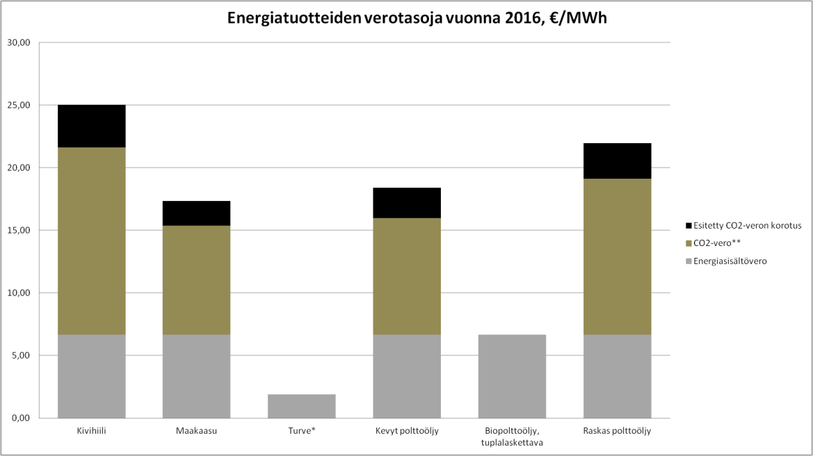 *Turpeella on energiasisältöveron sijaan energiavero, joka ei perustu turpeen energiasisältöön eikä polton hiilidioksidipäästöön muiden energiatuotteiden tavoin. Turpeen verotaso on tällä hetkellä 3,40 euroa/MWh. Verotason alentaminen 1,90 euroon/MWh (L 513/2015) on sidottu metsähakkeen tukijärjestelmän muutokseen.