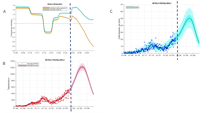 Tutkimustiedon mukaan etenkin virusmuunnos B.1.1.7 leviää 30-50 % aiempia virustyyppejä nopeammin ja johtaa useammin sairaala- ja tehohoitoon sekä tautiin menehtymiseen. Riskisuhde on keskimäärin ollut 1,3 – 1,4 -kertainen aiempiin virustyyppeihin verrattuna. Virusmuunnos voi johtaa nykyisellä tapausmäärälläkin 30 – 40 % kasvuun sairaalahoidon tarpeessa. Tartuttavuusluvun nousu 30 – 50 % nykyistä suuremmaksi kiihdyttää voimakkaasti epidemian leviämistä ja kiihtymistä, mikä myös johtaa sairaalahoidon tarpeen voimakkaaseen kasvuun. Mikäli väestön rokotukset eivät ehdi suojaamaan ikääntyneitä ja riskiryhmiä ennen virusmuunnoksen laajaa leviämistä koko maahan, epidemian vaikutus on entistä vakavampi.