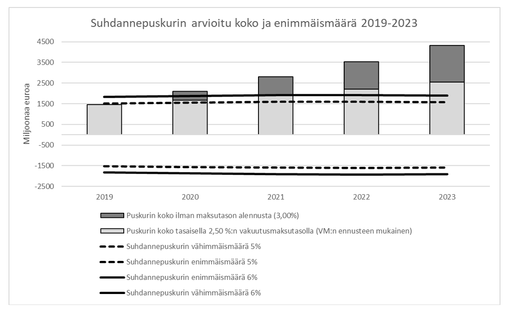 Alla olevasta kuviosta voidaan nähdä, kuinka suhdannepuskurin arvioidaan kasvavan valtiovarainministeriön talousennusteen mukaan vuosina 2019—2023. Kuvion mukaisessa ennusteessa on käytetty ensi vuodelle ehdotettavaa työttömyysvakuutusmaksun tasoa vuosille 2020—2023. Jos myönteinen talouskehitys jatkuisi nykyisenkaltaisena, ylittyisi suhdannepuskurin enimmäismäärä ensi vuoden lopussa, jos suhdannepuskurin kokoon ei tehtäisi muutoksia. On huomioitava, että jatkovuodet on arvioitu nyt tehtyjen taloudellisten ennusteiden perusteella ja ennusteet usein muuttuvat. Jotta suhdannepuskurin koko pysyy rajojen sisällä myös tulevina vuosina, vahvistetaan jatkossakin työttömyysvakuutusmaksut vuosittain.