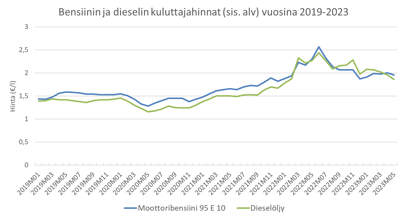 Kuva 1: Bensiinin ja dieselin kuluttajahintoja tammikuusta 2019 toukokuuhun 2023. Lähde: Tilastokeskus (2023).