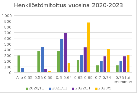 Kuvio 1. Henkilöstömitoituksen kehitys 2020-2023. Lähde: Vanhuspalvelujen tila –seuranta THL