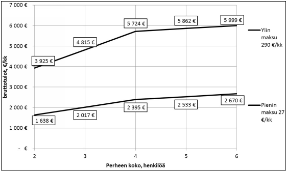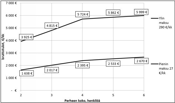 Maksu määräytyisi perheen koon ja tulojen perusteella. Mikäli perheen koko olisi suurempi kuin kuusi, korotettaisiin taulukossa olevaa maksun määräämisen perusteena olevaa tulorajaa 138 eurolla kustakin seuraavasta perheen alaikäisestä lapsesta. Järjestelmä vastaa muutoin voimassa olevaa asiakasmaksulain 7 a §:ää, mutta pykälässä olevia tulorajoja ja maksuprosentteja on tarkistettu hallitusohjelman tavoitteiden mukaisesti.