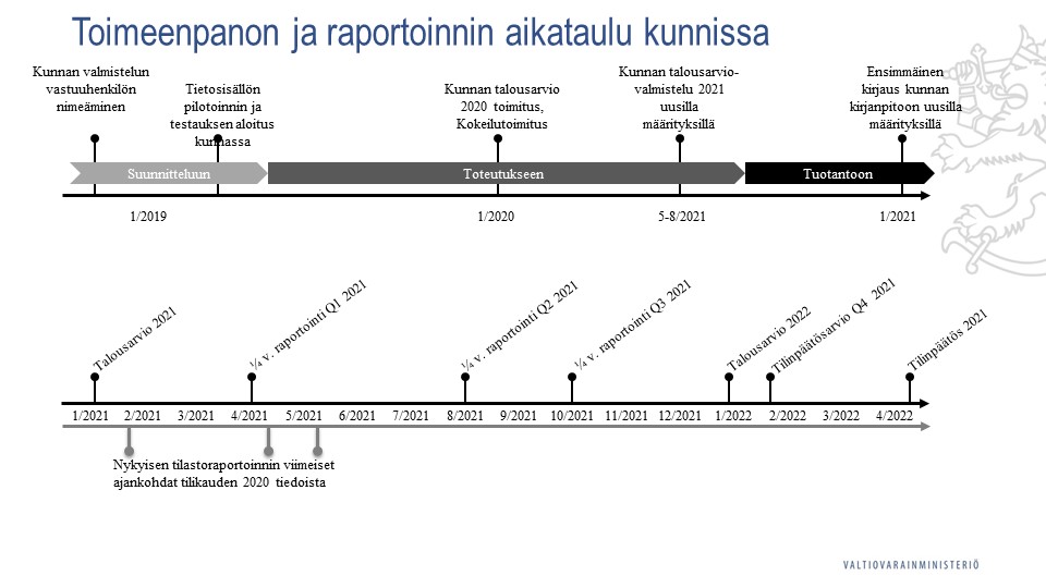 Lisäksi Valtiokonttori suorittaa valtiokonttorista annetun lain mukaan ne muut tehtävät, jotka säädetään tai määrätään sen hoidettaviksi. Valtiovarainministeriö on rahoittanut valtiokonttorin Kuntatieto-ohjelman tuotosten käyttöönoton suunnitteluhankkeen (VM/1210/02.02.03.09/2016). Suunnitelman mukaisten raportointipalveluiden toteutus ja käyttöönotto on alkanut kehittämisrahoituksen puitteissa marraskuussa 2016 ja jatkuu vuoden 2020 loppuun vielä toimeenpanoon liittyvänä projektirahoituksena. Nyt kyseessä olevassa esityksessä ehdotetaan taloustietovarannon ylläpitäminen säädettäväksi Valtiokonttorin tehtäväksi.
