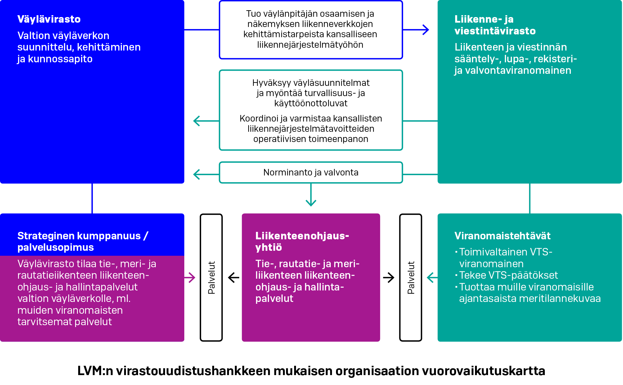 Liikenne- ja viestintävirastoon siirtyisi Liikennevirastosta vesiväylänpitäjien valvonta. Tehtävään kuuluisi määräysten antaminen liikenteenohjauslaitteista, sisältäen vesiliikennemerkit ja merenkulun turvalaitteet. Tehtävään kuuluu myös lupien myöntäminen merenkulun turvalaitteiden asettamisesta, vesiväyläpäätökset, kulkuväyliä koskevista kielloista ja rajoituksista päättäminen ja ohjeistaminen sekä vesiliikenteen ohjaamiseen liittyvien määräysten antaminen. Väyläpäätös on hallinnollinen viranomaispäätös, jolla päätöksessä mainitut väylät ja turvalaitteet vahvistetaan virallisesti käyttöönotetuksi.