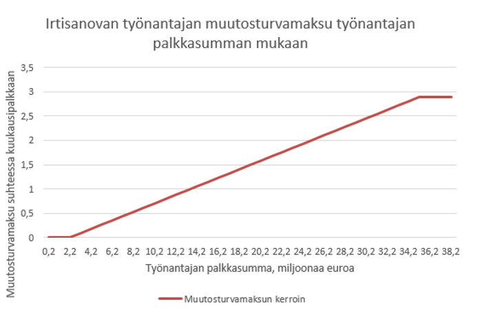 Pykälän 2 momentissa säädettäisiin työnantajan palkkasumman vaikutuksesta velvollisuuteen maksaa muutosturvamaksua. Irtisanovan työnantajan muutosturvamaksun määrä ehdotetaan porrastettavaksi työnantajan koon mukaan vastaavalla tavalla kuin omavastuumaksun määrä on porrastettu. Täysimääräinen irtisanovan työnantajan muutosturvamaksu perittäisiin yrityksiltä, joiden palkkasumma on vähintään 35 160 000 euroa. Palkkasumman ollessa pienempi, pienenisi maksu lineaarisesti alaspäin siten, että maksua ei perittäisi enää lainkaan, jos palkkasumma olisi enintään 2 197 500 euroa. Esimerkiksi palkkasumman ylärajan ja alarajan puolivälissä maksu vastaisi muutosturvarahan määrää kerrottuna luvulla 1,45. Palkkasummien rajoja tarkistetaan joka vuosi palkkakertoimessa tapahtunutta muutosta vastaavasti. Muutoksista säädetään työttömyysvakuutusmaksuista säätämisen yhteydessä.
