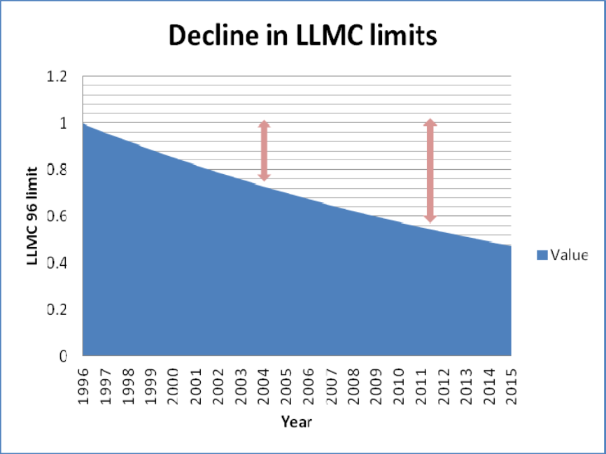 Kaavio 1: Suhteellinen LLMC 96 -rajojen arvon aleneminen.(Lähde: LEG 99/4/3, Relative decline in value of LLMC 96 limits)