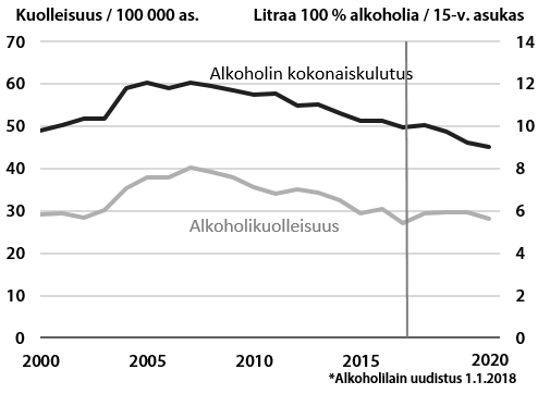 Suomessa alkoholin kokonaiskulutus kolminkertaistui vuodesta 1960 vuoteen 2005, jolloin alkoholin kokonaiskulutus 15 vuotta täyttänyttä asukasta kohti oli 12,1 litraa sataprosenttista alkoholia. Vuosien 2007 ja 2017 välillä alkoholin kokonaiskulutus laski noin viidenneksellä (kuvio 1). Useat alkoholiveron korotukset ja vuoden 2008 jälkeen pitkään jatkunut talouden laskusuhdanne myötävaikuttivat tähän kehitykseen voimakkaasti.