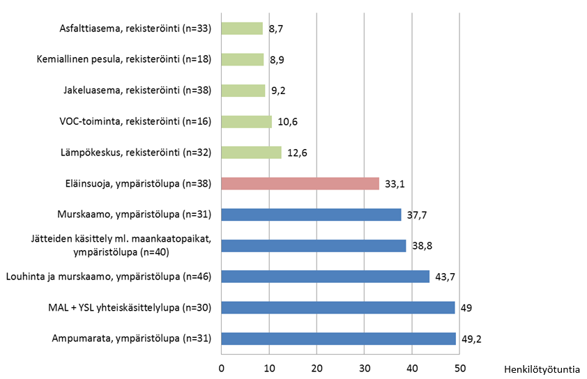 Taulukossa 1 on esitetty esimerkinomaisesti aluehallintovirastojen vuonna 2015 antamien ympäristönsuojelulain mukaisten sekä YSL:n ja vesilain mukaisten niin sanottujen sekahankkeiden lupapäätösten määrät. Eniten päätöksiä annettiin eläinsuojille (160 päätöstä), jätteiden käsittelytoiminnoille (143 päätöstä), energian tuotantoon (138 päätöstä) sekä turvetuotantoon (120 päätöstä). Lukuihin sisältyvät niin myönteiset kuin kielteiset päätökset, perutut ja käsittelemättä jätetyt hakemukset ja muut vastaavat. Lukuihin eivät sisälly annetut ilmoitus-, korvaus- ja oikaisuvaatimuspäätökset.
