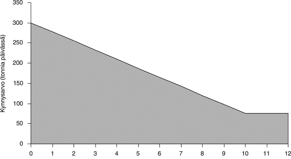k) eineksiä valmistava laitos, jonka valmiiden tuotteiden tuotantokapasiteetti on vähintään 5 000 ja alle 30 000 tonnia vuodessa, mutta enintään 75 tonnia vuorokaudessa, jos valmiiden tuotteiden tuotantokapasiteetin eläinperäisen raaka-aineen osuus on vähintään 10 painoprosenttia; muuten 300 - (22,5 x A) tonnia vuorokaudessa ja alle 30 000 tonnia vuodessa, kun A on valmiiden tuotteiden eläinperäisen raaka-aineen osuus painoprosentteina