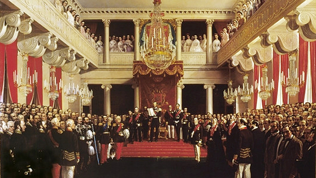 Riksmötets öppnande år 1863. R. W. Ekman: Kejsare Alexander II förklarar ständermötet 1863 öppnat i tronsalen i kejserliga palatset. Foto: Markku Haverinen / Museiverket CC BY 4.0. Fotot har beskurits.​